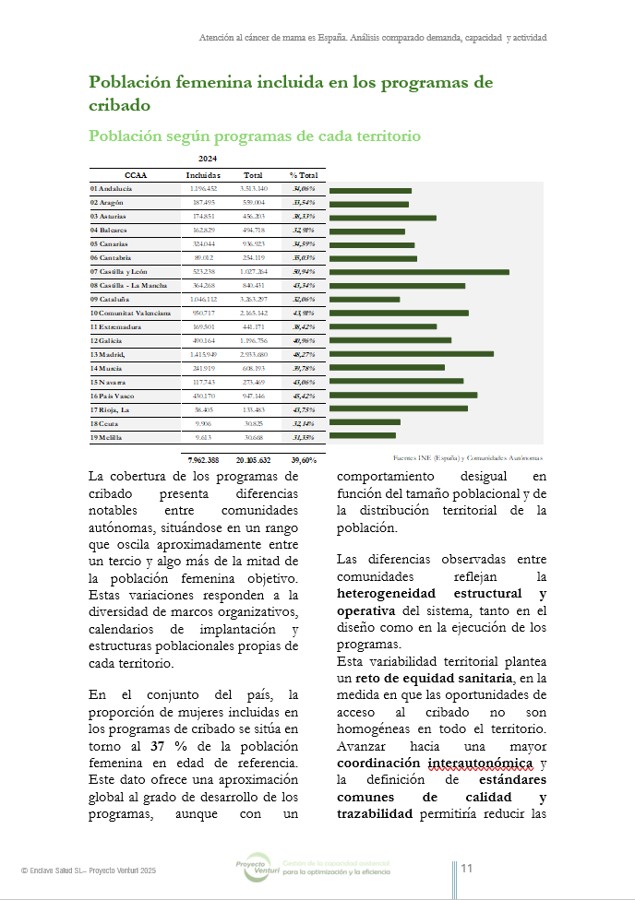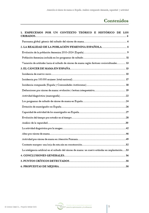 Incluye datos por comunidades autónomas, tendencias en cribado y cobertura poblacional, dotación y rendimiento de mamógrafos, evolución de la incidencia y mortalidad, papel de la atención primaria y continuidad asistencial, así como el impacto de la inteligencia artificial en la detección precoz.